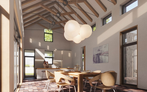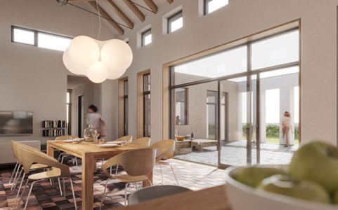 Mitten im sonnigen Burgenland machen wir mediterrane Träume wahr. Das zentrale Element bildet ein „Wohnschiff“ – die klassische Wohnküche wird damit neu interpretiert, ein heller, großzügiger Wohnraum entsteht. Dieses Wohnschiff wurde als eigenständige Kubatur in den umgebenden Flachbau eingebettet, aus dem die weiteren Einheiten, wie beispielsweise Höfe, „ausgestanzt“ wurden. Alle Räume verfügen dadurch über zweiseitige Belichtung.