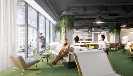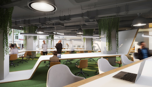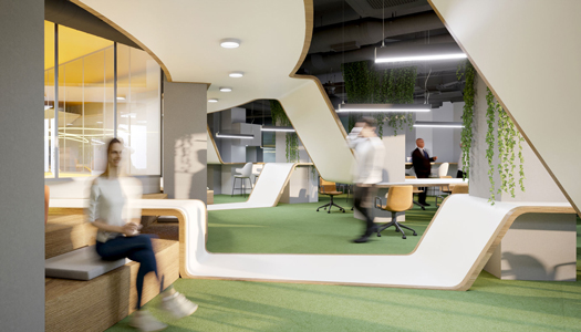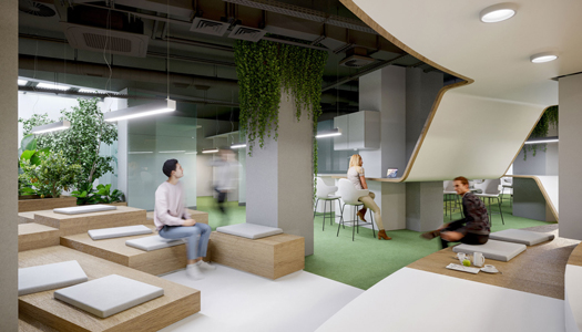 Die Arbeitsbereiche sind freundlich und warm gestaltet – und laden zum Verweilen ein. Natürliche Materialien, gute Atmosphäre und eine bepflanzte Skylight Zone mit Sitzwürfeln versprechen produktive Stunden. Eine Tisch-Wand-Boden-Skulptur begleitet den Raum und schafft Wohlfühlzonen zum Loungen.