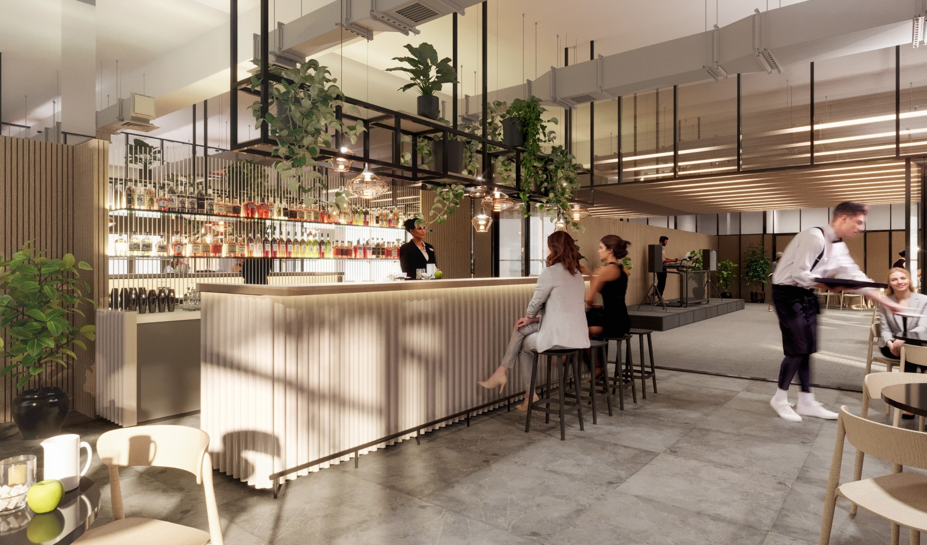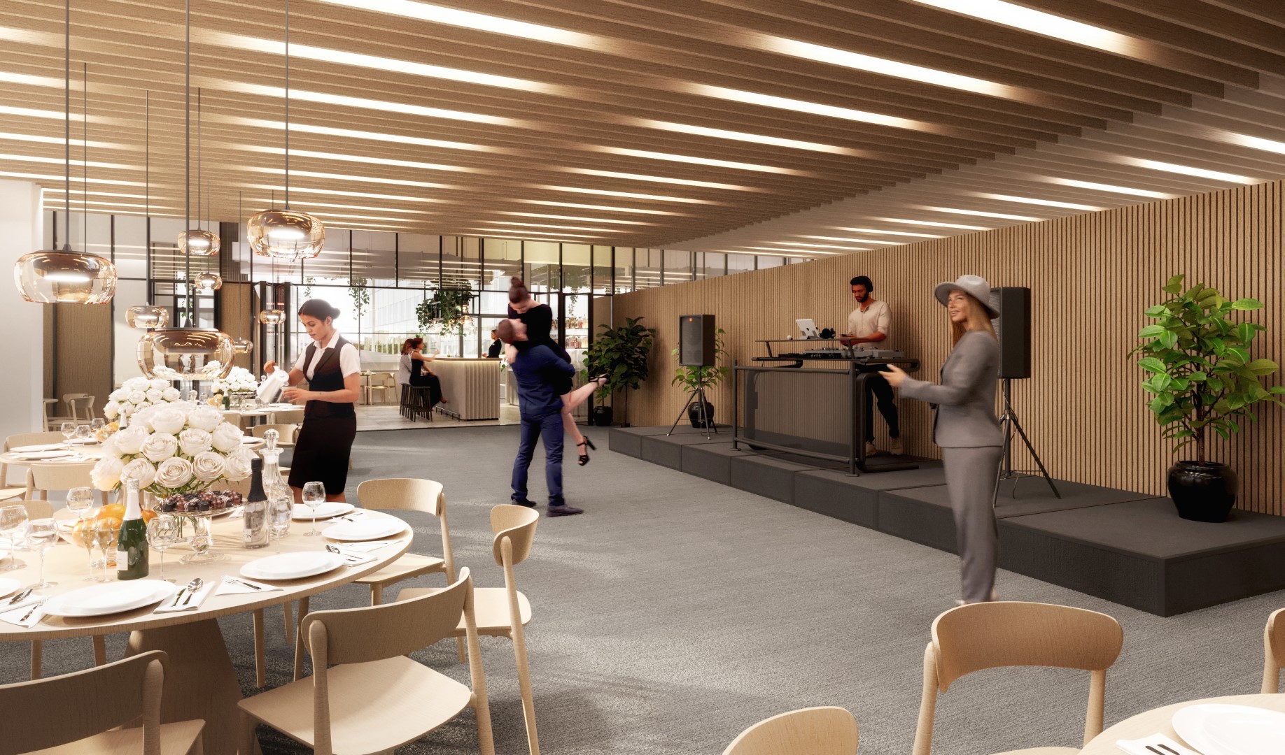 Frischer Wind im Flachbau des IZD Tower: Die Multi-Purpose Area im 4. Obergeschoß des IZD Tower Flachbaus bietet eine Vielzahl an Nutzungsmöglichkeiten, vom geplegten Präsentationsraum bis zur großzügigen Tanzfläche mit Bühnenbereich, abgerundet durch eine elegante Bar, perfekt für den entspannten Afterwork Cocktail.