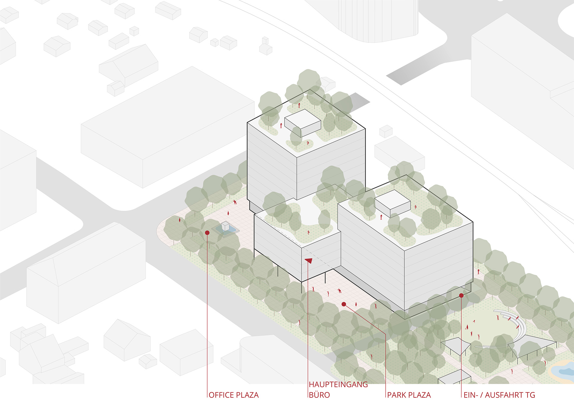 Den städtebaulichen Grundgedanken bildet bei diesem Wettbewerbsbeitrag die Blockrandbebauung als Begrenzungslinie des Grundstückes. Zwei Baumreihen fassen die Bauplatzgrenzen um das ÖBB Areal Ostbahnhof in der Grazer Raiffeisenstraße ein. Ein grüner Blockrand entsteht, auf dem die Bauvolumina frei angeordnet werden. Office- und Wohneinheiten werden auf zwei Bauplatzteilen unabhängig voneinander bestmöglich entwickelt: